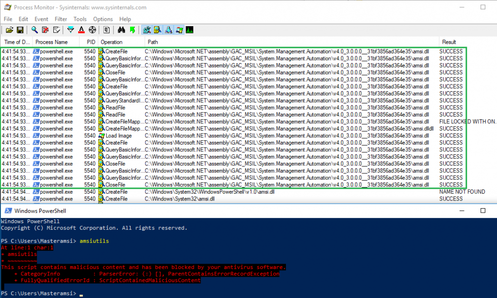 A look at ProcMon’s filtered output showed that the DLL was successfully loaded and PowerShell was functional this time. This suggested that the calling process was happy with the custom DLL, but AMSI still kicked in and blocked the execution of the command. It seemed that Microsoft possibly implemented a fix against the original DLL hijack.