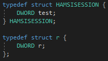 Before compiling the project, Visual Studio already helpfully pointed out that several variables were undefined, namely HAMSICONTEXT, HAMSISESSION, AMSI_RESULT and r. MSDN publicly documents the definition of AMSI_RESULT, which turns out to be an enum. However, there is no documentation for HAMSISESSION, HAMSICONTEXT, or the r argument. Similar work on AMSI has been done by other researchers, for example, modexp provided a stub structure for HAMSICONTEXT. Great, two out of four undocumented structures done. For the two remaining ones, I was unfortunately not able to find any information. So I made two stub structs.