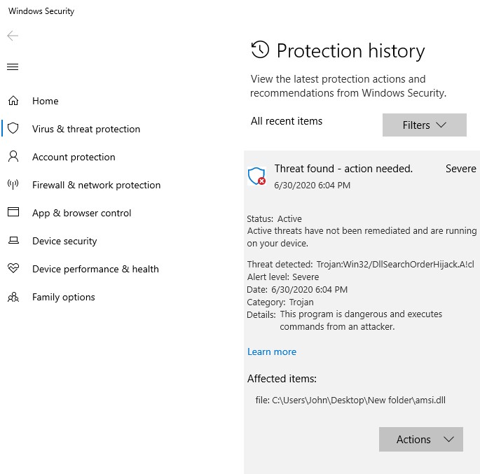 While preparing this blog post, it seemed that Windows Defender added some capabilities to detect the DLL hijack at least from a low privilege users’ perspective. This may have happened between the 28th of June 2020 and the 30th of June 2020. A similar observation was made when attempting to copy the amsi.dll to the other folders only writable by administrative users. So, updating Windows Defender should be enough to help prevent this proof of concept at least.