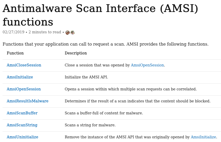 Luckily, the functions exported by AMSI are documented by Microsoft. This significantly simplifies the task of reimplementing the AMSI DLL. Based on MSDN, only 7 functions needed to be implemented.