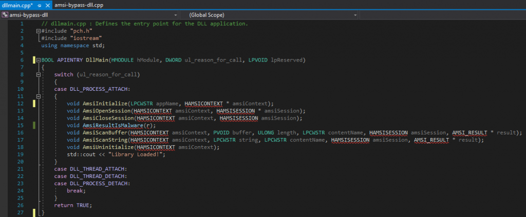 When creating a DLL project in VS, a default template is provided. The entry-point into a DLL called DllMain would be executed when the calling process starts or when the LoadLibrary function is called. The DLL will be loaded into the virtual address space of the current process when the system calls DllMain with the DLL_PROCESS_ATTACH flag. This is also where our functions will be defined. After reading the MSDN documentation about AMSI, I redefined the functions to include the correct receiving arguments: