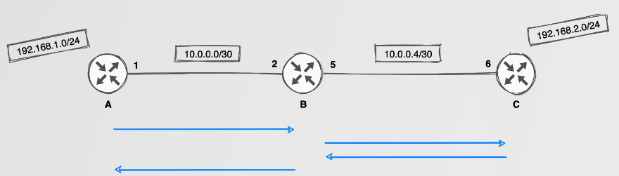 Static routes are well understood and can be configured to direct traffic between two networks, say 192.168.1.0/24 to 192.168.2.0/24. This, however, requires a total of four static routes to be configured on various routers. Not a big deal, right?