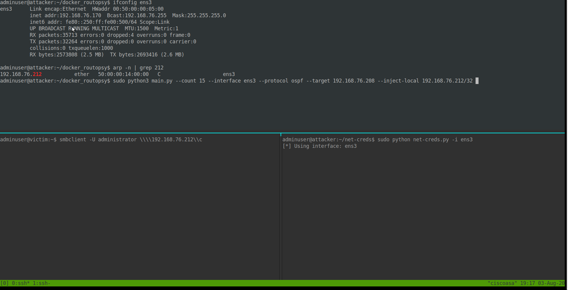 Some of our first attacks were done by bridging Virtual Machines with a target network, running something like a Fortinet Firewall and configuring the firewall to learn and inject routes. This had many issues including that it was hard to configure these appliances and we often wanted more specific control over our attack, which wasn’t always easy to achieve. With us finding these protocols more often than we expected, we decided to automate some of the work so that we could focus on impact faster. Our idea was to build a tool similar to the likes of yersinia and loki, but with a slightly more modern approach and by doing so, hoping that people would become more familiar with and interested in understanding, securing and attacking these protocols.