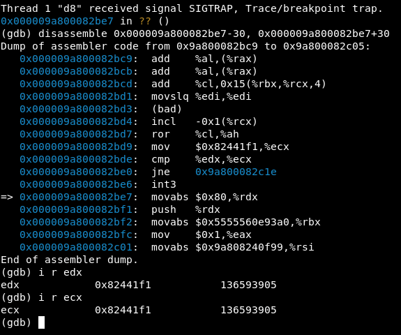 As we can see, there’s an int3 instruction there (a breakpoint) in the JIT’d code that was executed due to a safe bailout (cmp %edx, %ecx; jne 0x9a800082c1e;). This is to prevent something more harmful from happening, for example, someone trying to exploit the type confusion.