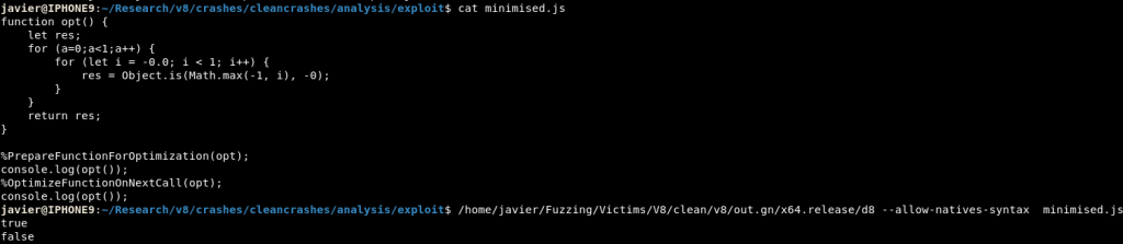 This is almost the same logic that ForceV8TurbofanGenerator has. I say almost because while it’s ensuring optimisation, it wasn’t ensuring that calls with different parameters could trigger crashes. It is important to try and trigger a crash because type confusion bugs will likely yield no crash, as we’ll see in the Proof-of-Concept later.