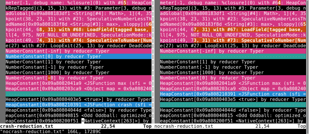 As we can see in the vim diff, ZeroOrMinusZero and the Zeroish types are not in the second NumberMax pass. By itself, this analysis might or might not mean that something is wrong with the types, but it’s a way to correlate with source code analysis and turbolizer that a type has been lost.