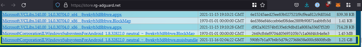For demonstration purposes, let’s see how to install Microsoft’s limited WSA distributed through the insider program. We won’t modify it to allow Google Play Services to work, or to side load applications, that’s done in the next section, and you’ll have to uninstall this. So this is really just to show the difference. The MSIXBundle that you will get when signing up for the Insiders Program file can be discovered using this service. This site is a link aggregator for downloading directly from the Microsoft store. Credits to RG_Adguard for this.