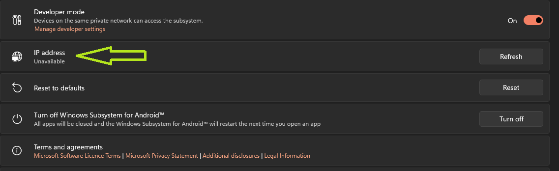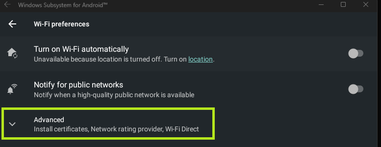 At this point you’ll have a basic WSA installation up and running. However, it is limited to the Amazon app store, and that is not very useful for what we want to do!
