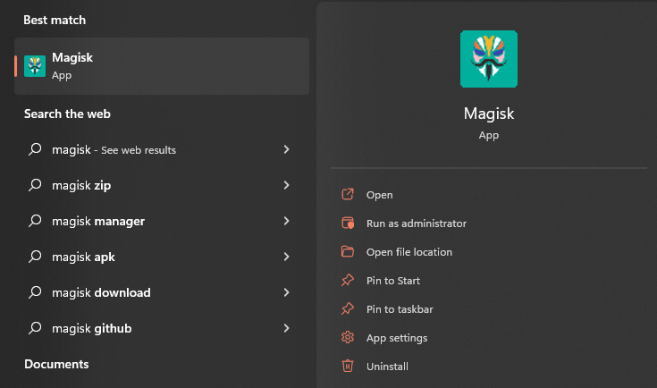 Installing applications is as simple as ADB install ‘APK Name’. We will be installing Magisk in this manner with ADB install magisk.apk. Once installed, click on Start and search for Magisk. As WSA shares resources with Windows, Magisk can be opened from the Start menu as if it is installed in windows directly, however it is running seamlessly under WSA.