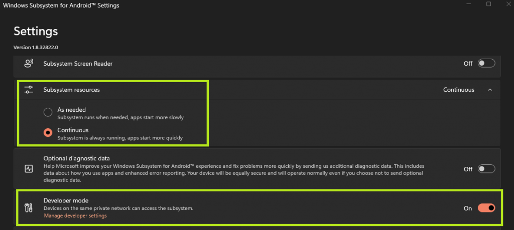 Once the application is open, you’ll see a couple of options. The first is choosing to have the subsystem resources available as needed, or continuously available. This is a personal preference. I chose to have them running continuously, as I have resources to spare.