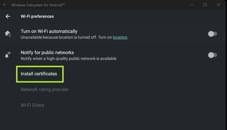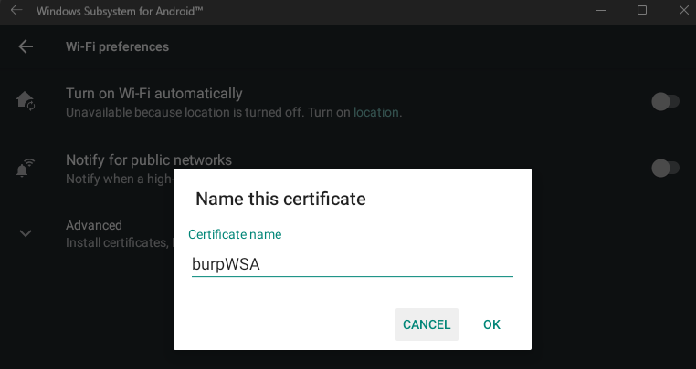 When in the VirtWiFi settings, I was able to select the Advanced options to install certificates. Knowing this, I generated a certificate from Burp Suite and moved it to the “device” using: