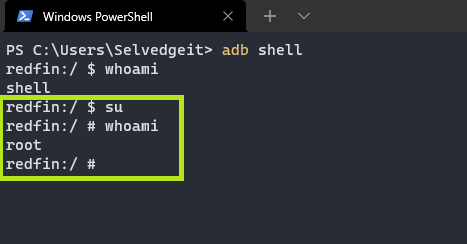 In the terminal, type ADB shell to gain access to the WSA “device”. We can confirm the current user with whoami.