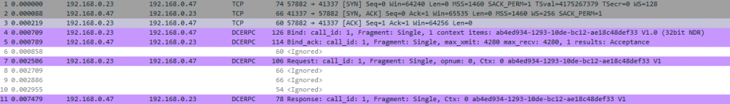 Next we can see four packets in purple. These packets constitute the DCERPC binding operations and RPC calls. Taking a closer look at the payloads, you can the the first packet tries to bind to a context_item which is composed of a UUID and the version of the interface: