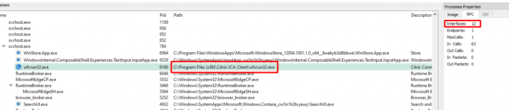 Concerning the Windows service issue. As with any other service it might be interesting to look for write ACL’s on binaries used by legitimate services. So first we will need to list existing RPC interfaces. This can be done with the RPCView.exe. For example the following binary exposes 12 interfaces: