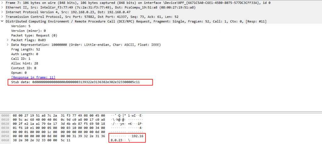 The binding process will create a logical connection between the RPC client and the RPC server and will result in the creation of a binding handle. Using this logical connection we will be able to send the data and receive the result. Below you will find a capture of the network traffic sent between the RPC client and the RPC server when connecting: