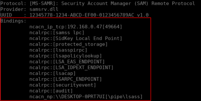 Using these string bindings we have enough information to be able to connect to an endpoint. The next step is to bind to an interface. To do so, we need two pieces of information that, once again, are exposed by the epmapper: the UUID of the interface and its version.
