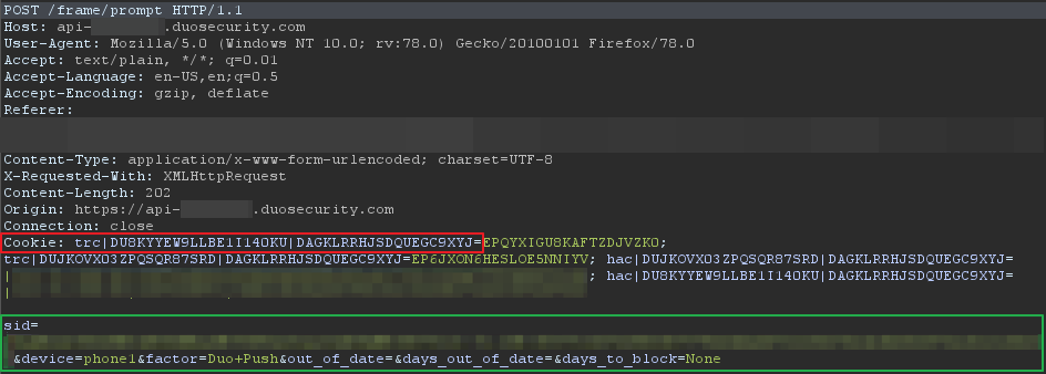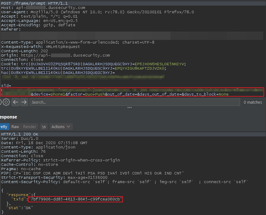 While having a closer look at the generated HTTP traffic in Burp, I decided to give Duo another look. We had extra application accounts which we could use for testing, which is important as you’d see shortly. During a typical authentication flow, a user would eventually trigger a two-factor authentication verification that is sent to a Duo endpoint via a POST request, e.g. below: