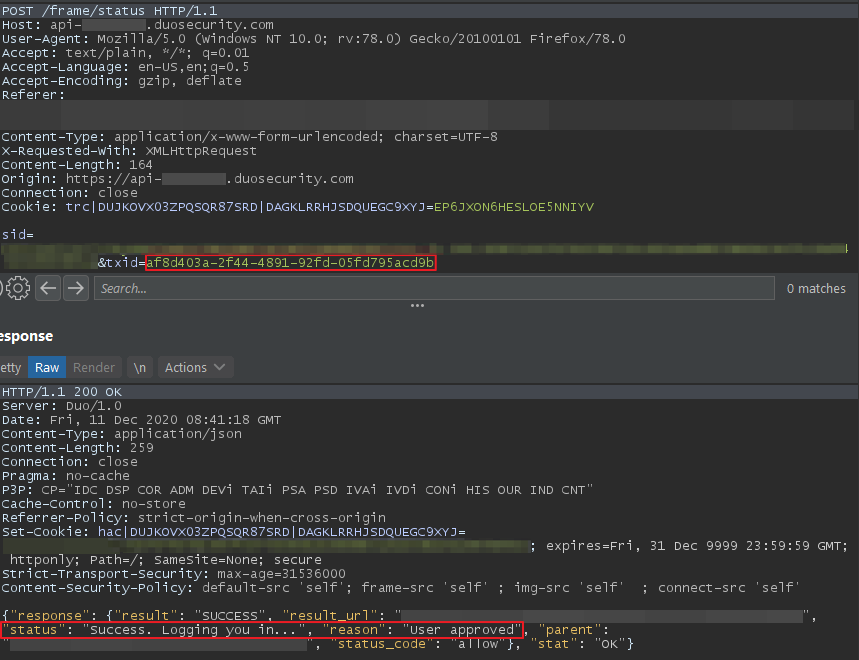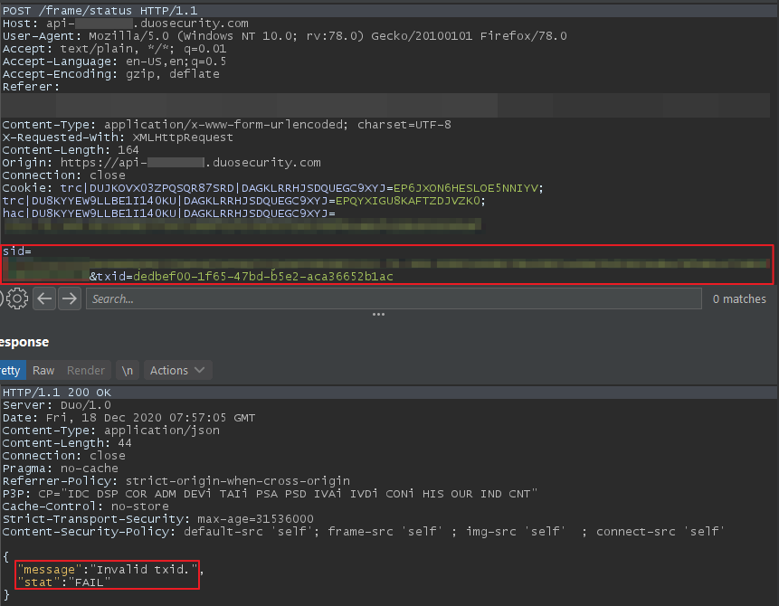 We drafted a report detailing the bypass and sent it to Duo Security. They responded quickly and fixed the bug. I attempted the bypasses again to confirm whether the temporary fix worked. I tried using both the sid and the txid values, but now neither method worked.