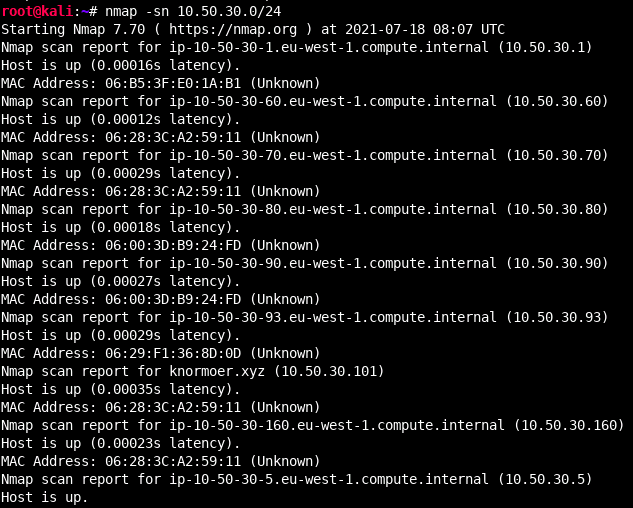 This helps us to reduce our scope from a full /24 (255 hosts) to a handful of hosts. By sending ICMP packets, we can assume a host is up if it responds with an echo reply. This is clearly useful, however if we are interested in being stealthy we may not want to send any packets on the network. Additionally, what would happen if ICMP was blocked? Well in this case we could consider doing a list scan. By using the -sL flag we could list the hosts in a provided network without sending any packets on the network. By itself that is not really useful, however, this scan type will by default do a reverse DNS lookup which can help us identify computers on the network (and often their use) just by their name.