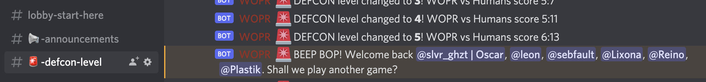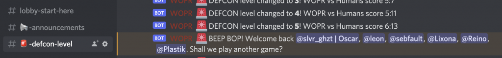 The bot would win in two conditions – either the game times out, or you actually lost as a human. The bot would announce each DEFCON level change in a channel, and when it reached DEFCON level 1, it would start launching nukes, killing members.