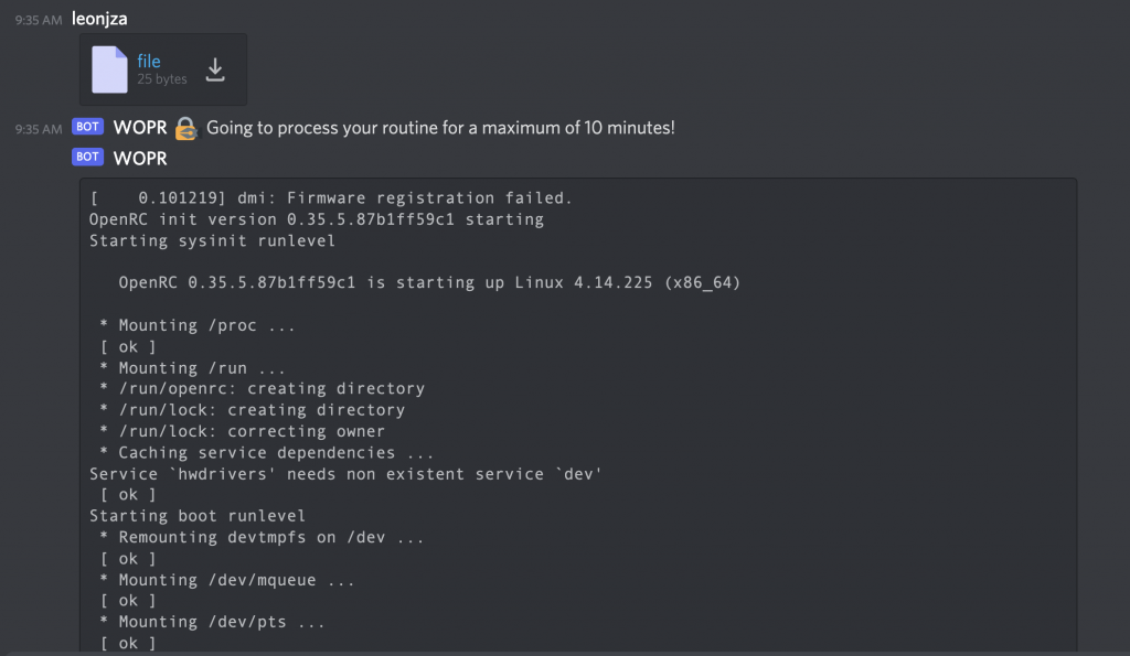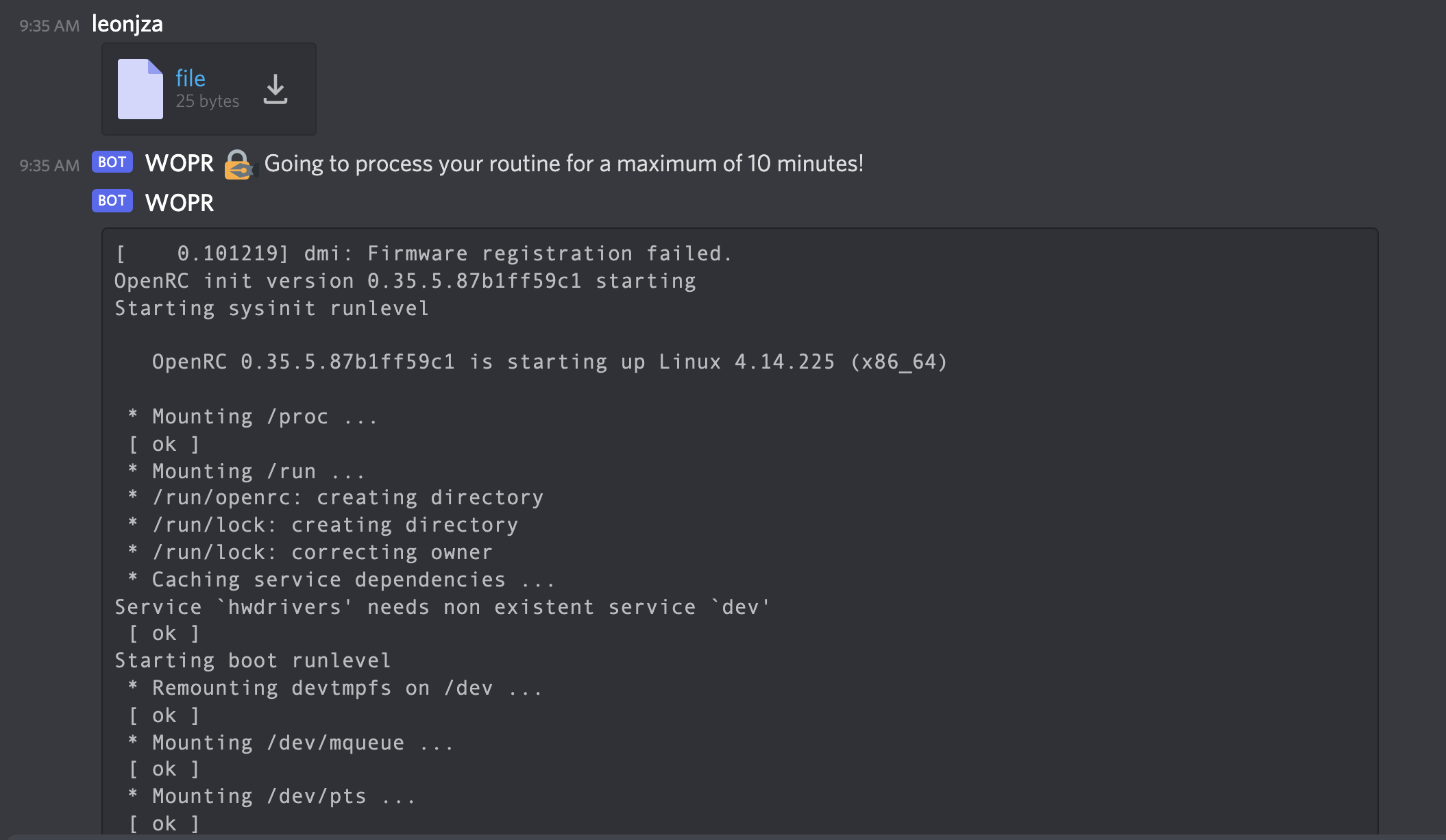 Behind the scenes, a Firecracker MicroVM is booted and the player’s uploaded file mounted in and its console output streamed to Discord.
