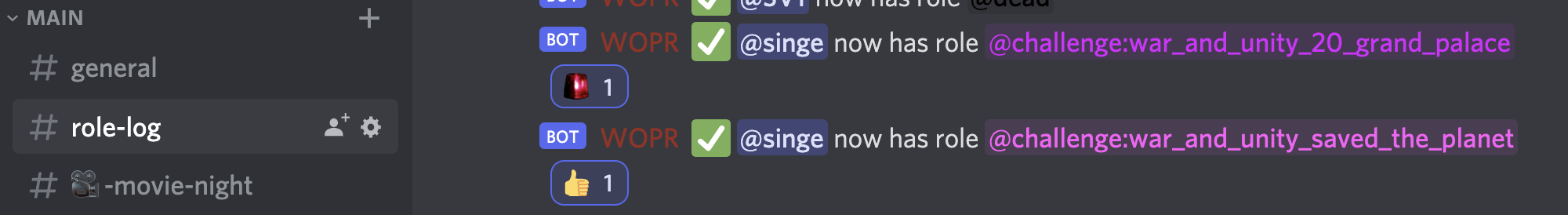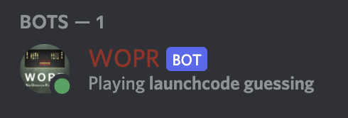 Once killed, you earned a “dead” role. Having this role meant that you could no longer use any challenge commands (ie. commands starting with an &). The only way to come back was to have the human’s score be more than the WOPR score, pushing the DEFCON level back to level 5. At level 5, the bot would concede and “revive” all dead players. This mechanic encouraged some group work to get others to play tictactoe to win again :D