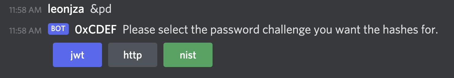 The password cracking challenge, contributed by Marlise, Marianka and Szymon was composed of three parts. The challenges were called Nist, Http and Jwt, and you could get the hash lists by running the &pd command.