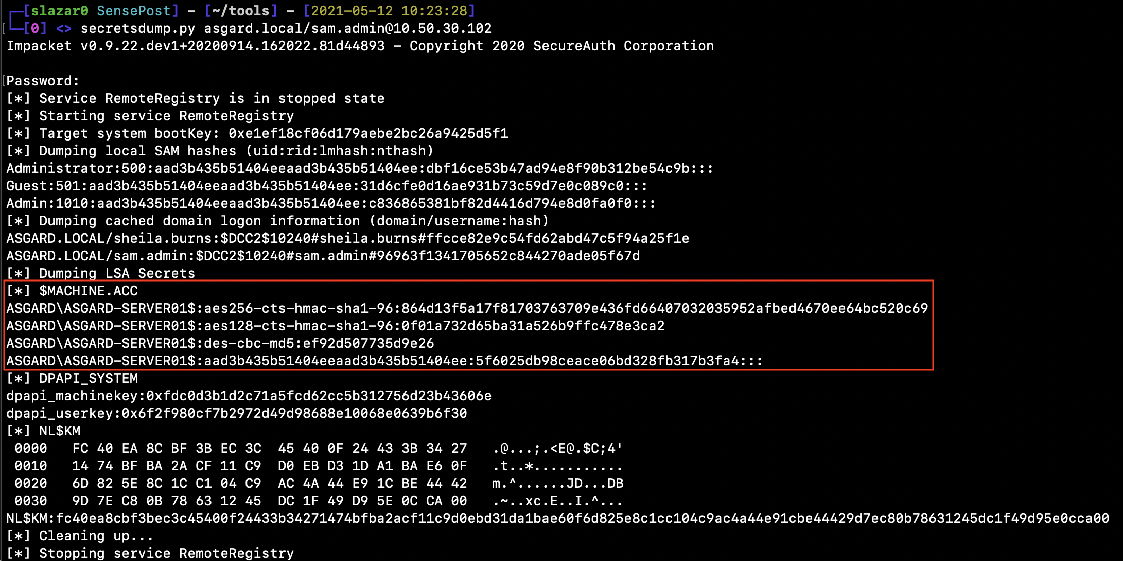 Since ASGARD-SERVER01 is configured to present delegated credentials to ASGARD-SERVER02, the ASGARD-SERVER01 machine account NTLM hash is required to abuse the delegation configuration. Assuming that we have somehow, magically, compromised this host with SYSTEM privileges, we can easily retrieve its hash using Impacket’s secretsdump. Impacket is not the only way to achieve this, but it does the trick.