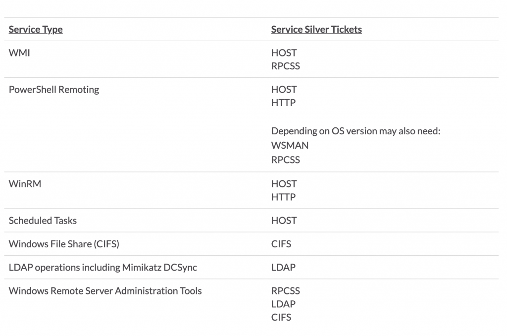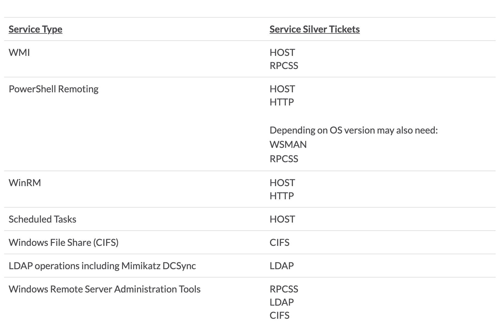Therefore, knowledge of the ticket issuance process and identifiers for the various Windows services can be beneficial to adversaries, and aid in lateral movement. The ADSecurity blog post on silver tickets provides the mappings of the service ticket type required to access specific services, which can be a useful resource when using these for lateral movement. These mappings are shown below.