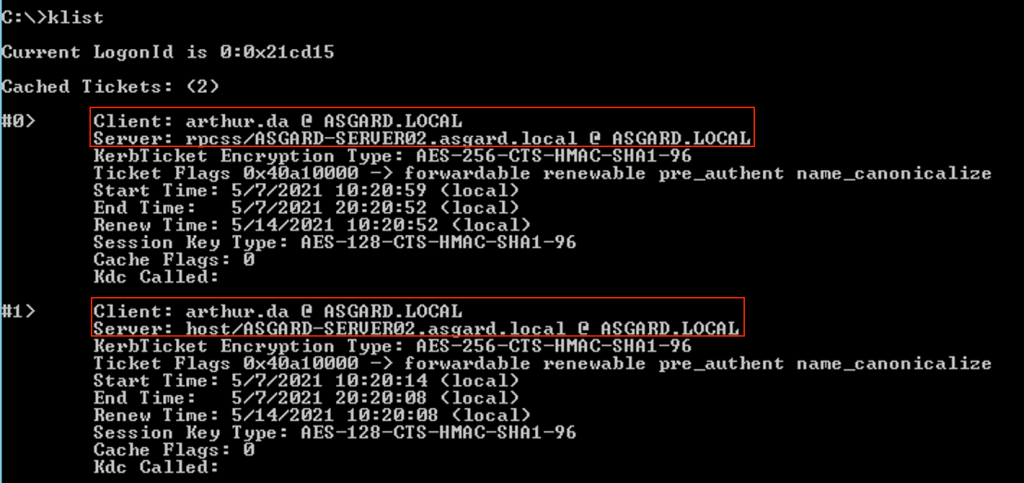 If we connect to ASGARD-SERVER02 using Enter-PSSession we’ll be able to execute commands remotely. If we execute klist on the target host, we’ll notice that the HTTP service ticket is available there as well: