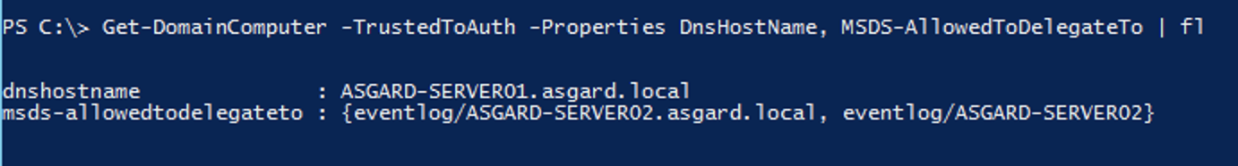 As shown below, the ASGARD-SERVER01 has been configured to present delegated credentials to the eventlog service of ASGARD-SERVER02.