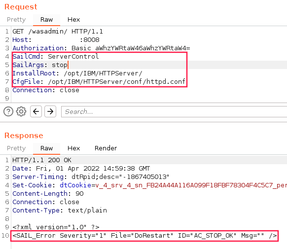 IDA also revealed that the SAILArgs header for ServerControl command could be set to either stop, start, restart or status.