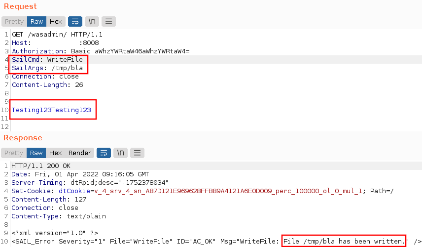 The WriteFile command was a bit more interesting. For this command to work, you needed to specify the path of file you want to write to in the SAILArgs header. The data you wanted to put in the file was simply put in the body of the request. Strangely this needed to be a GET request.