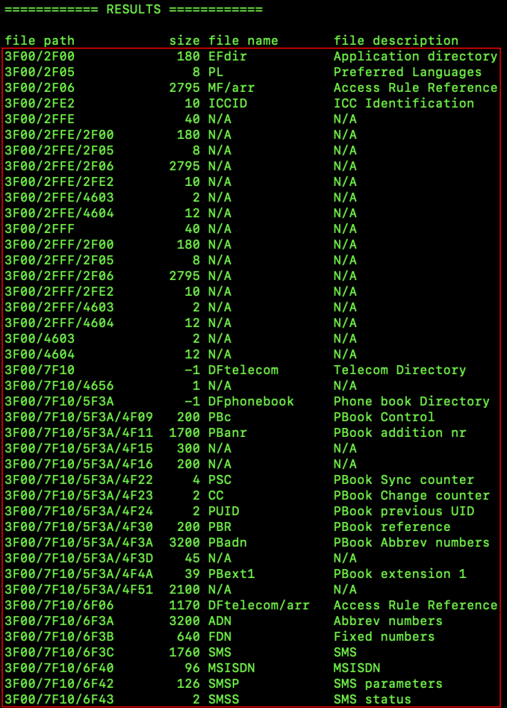 The hypothetical top-level directory of the system I was analysing (SUT) was designated by a slash (/) and that is known as the Master File (MF). It contained subordinate directories, otherwise named Dedicated Files (DF), and Elementary Files (EF), where a great number of Mobile Network Operator (MNO) and subscriber sensitive information could be found.