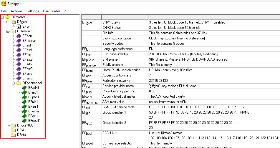 Being more interested in the content of a SIM card rather than its physical aspects, I analysed the content of a random one by using the PC/SC terminal Gemalto PC Twin Reader together with a forensic tool named SIMspy II. By checking the output returned by this tool, it was clear that information was stored in a directory structure.