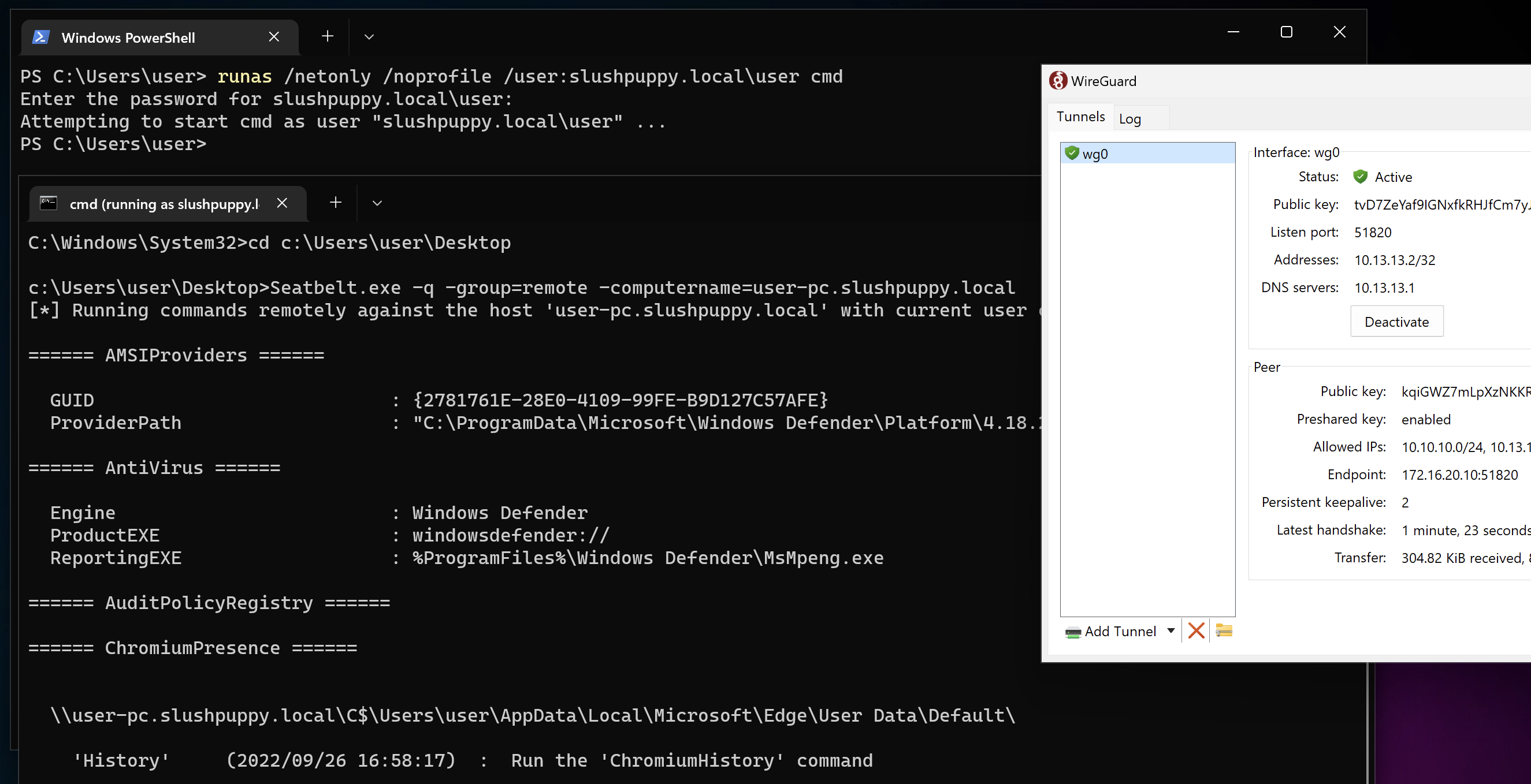 Using docker compose to glue the services together and to set this up quickly on a jump box, I gave it a test and was able to get SeatBelt.exe into the network from my own Windows VM just by connecting to the WireGuard VPN. \o/