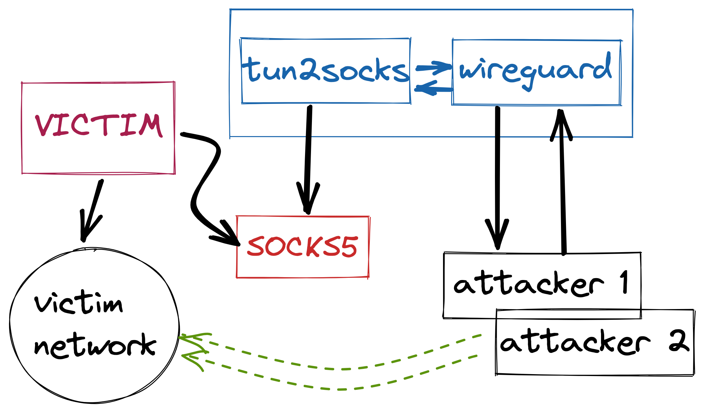 I built some infrastructure that you could deploy and use to easily tunnel from arbitrary sources over a proxy such as SOCKS, using anything that can run WireGuard. This is convenient in cases where it would be nicer to have a full network route to a target network (with working DNS) vs just having application specific proxy rules. In this post I’ll elaborate a bit on that idea. If you are just looking for the code you can find it here: https://github.com/sensepost/wiresocks.