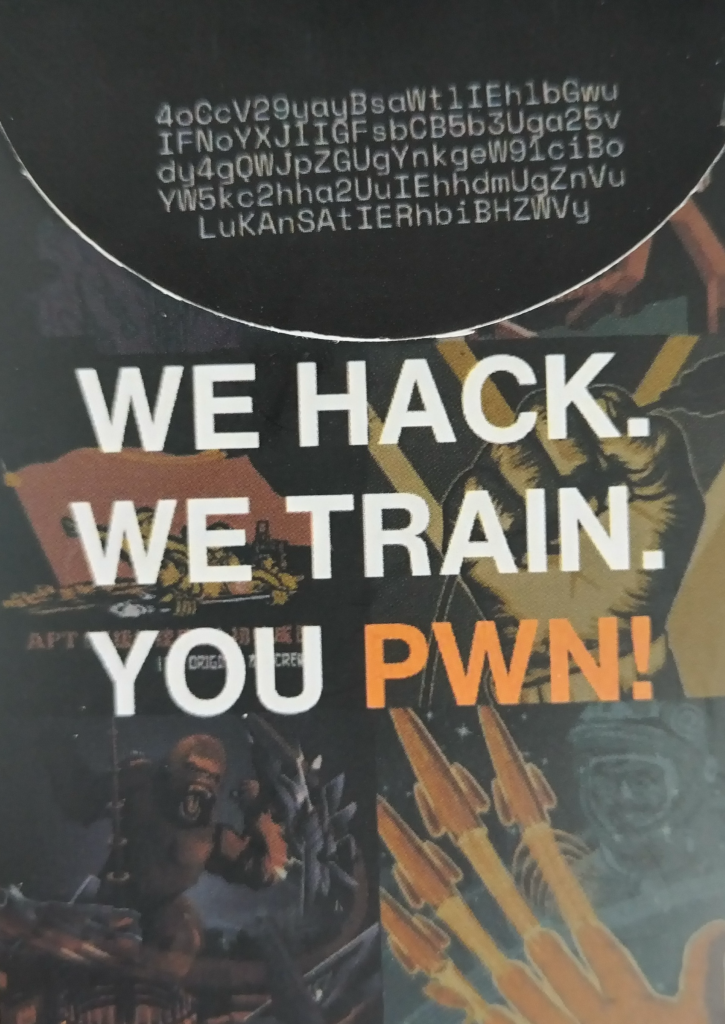 On the back on the cards and large in your face on the front of the box the phrase “WE HACK WE TRAIN YOU PWN” could be found. If we put that into CyberChef we see that it was the code.