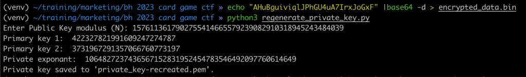From there it’s as simple as recreating the decryption key and regenerating a private key to decrypt the garbage hidden in the base64 encoded string. Simplified how that’ll look: