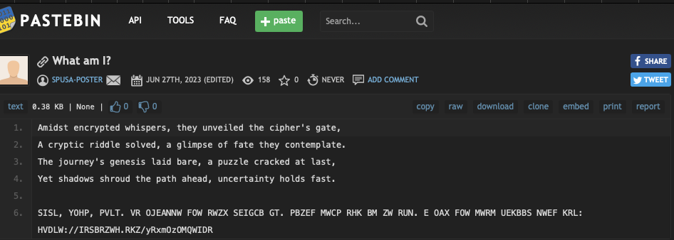 Having decoded the binary back to ASCII, we will receive a pastebin link. From here you will be presented with a lovely poem (thoughtfully written by ChatGPT) and some sort of encrypted text. By its intention and design it’s pretty easy to see it is a cipher, from the HVDLW://IRSBRZWH.RKZ/yRxmOzOMQWIDR which appears to follow the structure of a URL. However “HVDLW” cannot be a simple shift otherwise VD would be the same letters being that it comes from TT, if we assume its HTTPS. This rules most basic ciphers like Caesar and ROT13.
