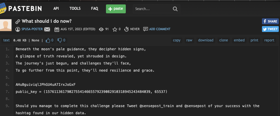 More poems (more thank you’s to ChatGPT), some garbage looking string and a public key. To the observant you will straight away notice the sting is likely to be base64 encoded.
