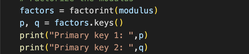 This was the trickiest part as it is computationally difficult to find the the two prime numbers. I used sympy’s factorint function which returns “a dictionary containing the prime factors of n as keys”.