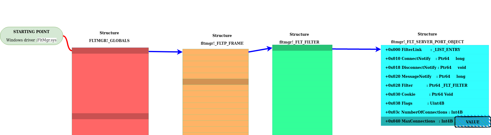 I agree with Alex Ionescu when he said “I got 99 problems but a kernel pointer ain’t one” :-). We can find MaxConnections address by walking through Windows kernel data structures, starting from FltMgr.sys driver up to this field!