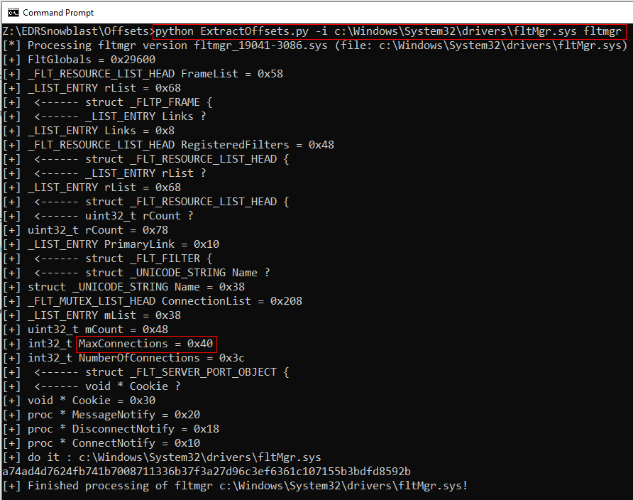 Offsets could change after Windows updates, personally I use a customised version of EDRSandblast’s ExtractOffsets.py script (available in EDRSnowblast). Output example is shown below.